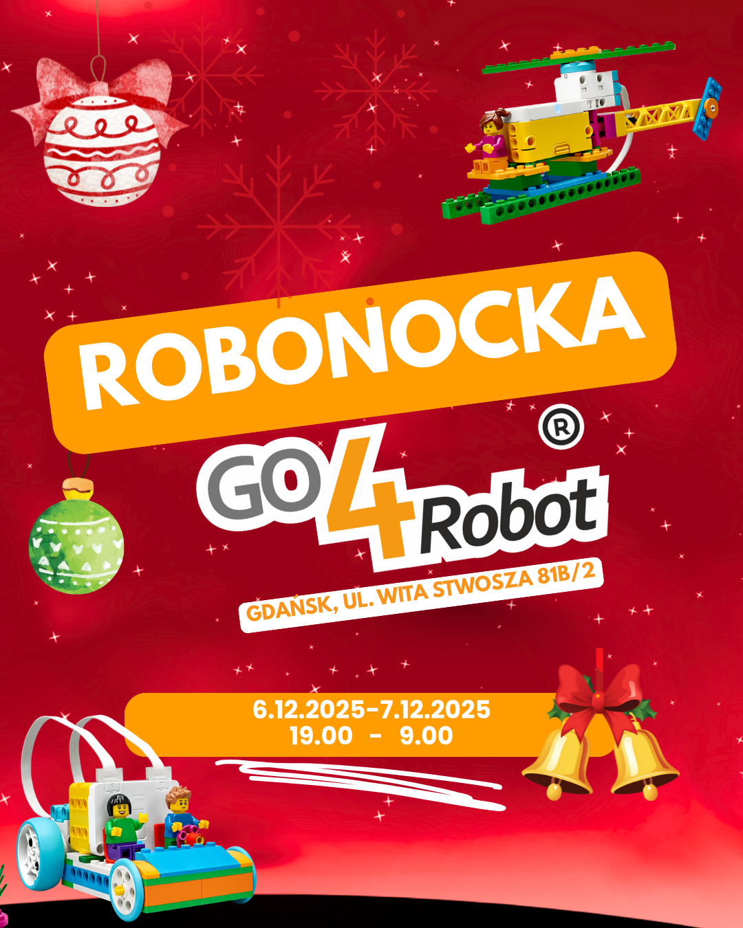 RoboNocka to wyjątkowe, wieczorno-nocne wydarzenie edukacyjne dla dzieci, które łączy robotykę, programowanie, kreatywne zadania i pracę zespołową w formie pełnej przygód „nocki”. Uczestnicy budują i programują roboty, rozwiązują misje, biorą udział w wyzwaniach logicznych oraz ćwiczą współpracę – wszystko w bezpiecznych warunkach i pod opieką doświadczonych trenerów.